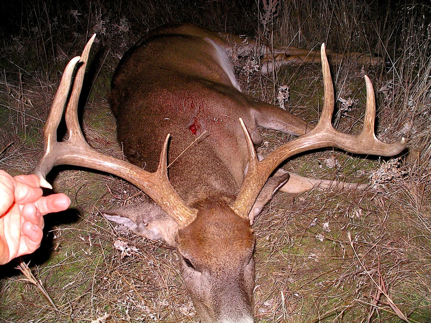 Not an aesthetically pleasing image, but it shows the entrance for the first 60-grain Partition that knocked this buck out for a few seconds. Then he rose and ran right into another partition.