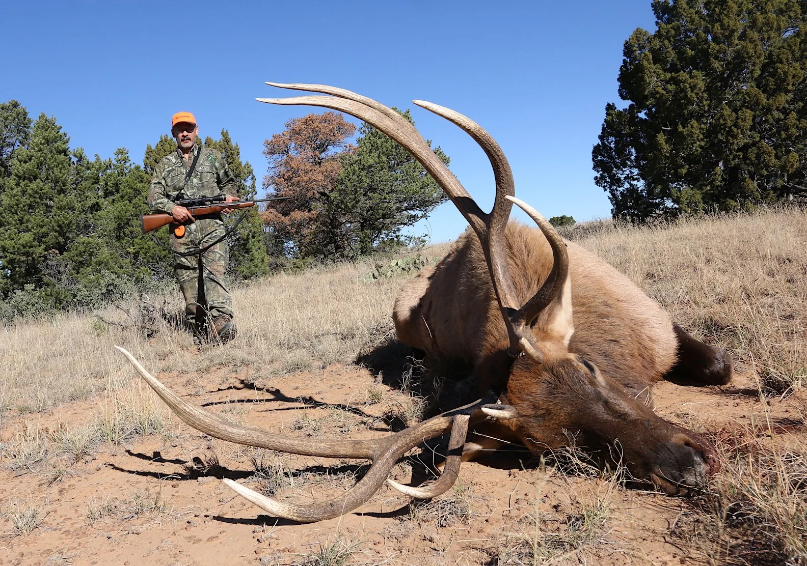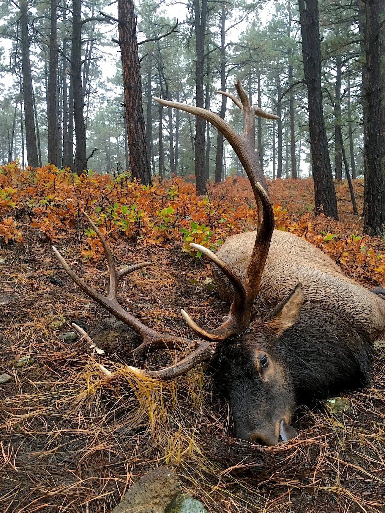 Hunt two: I send a 160-grain AccuBond from Mossberg Patriot 7mm Rem. Mag. to an elk’s left shoulder from about 70 yards. The elk turns and starts fast-walking away. I put another 160-gr. AB in its right shoulder. It twitches slightly and keeps moving. I try for a high shoulder/spine shot that wobbles the bull. It manages a few more lunges and topples behind a juniper.