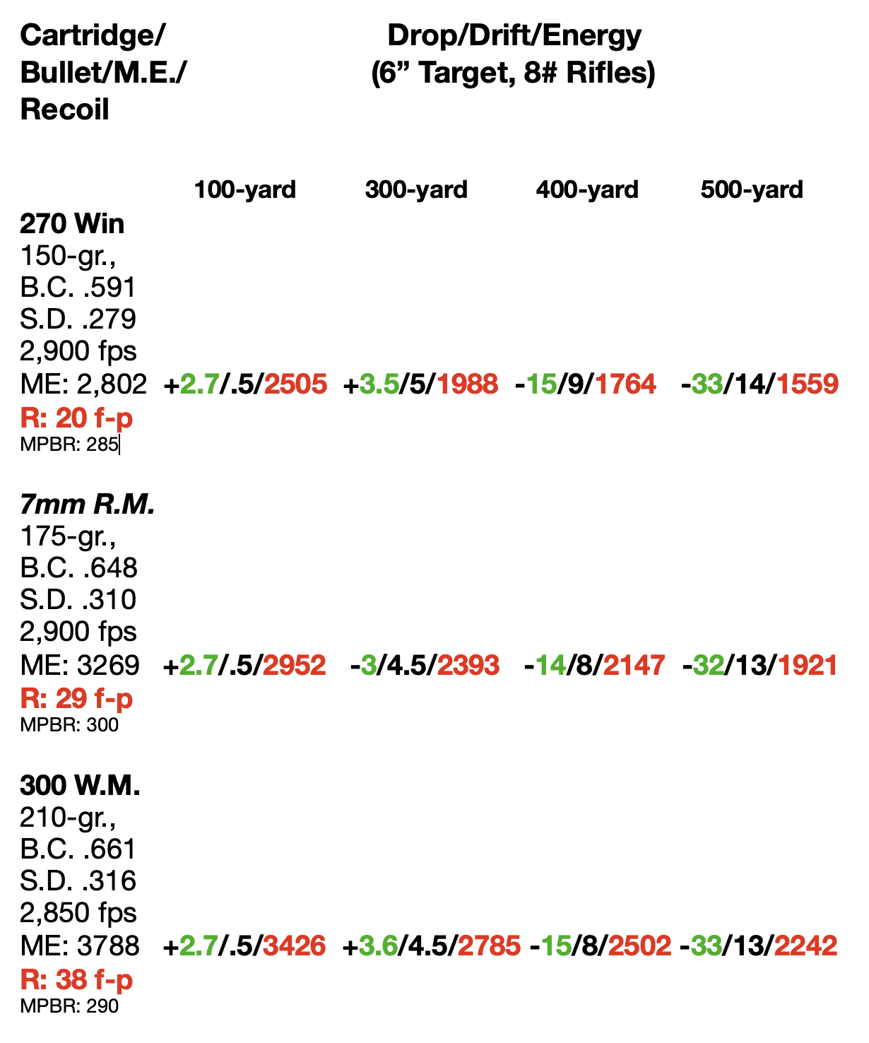 Here’s the strongest leg for magnum fans to stand on. Yes, the 300 Win. Mag. produces and retains the greatest energy, besting the 7mm Rem. Mag. by 355 f-p at 400 yards, 321 f-p at 500 yards. The poor old 270 Win. gives up 362 f-p to the 7mm Rem. Mag., a whopping 683 f-p to the 300 Win. Mag.