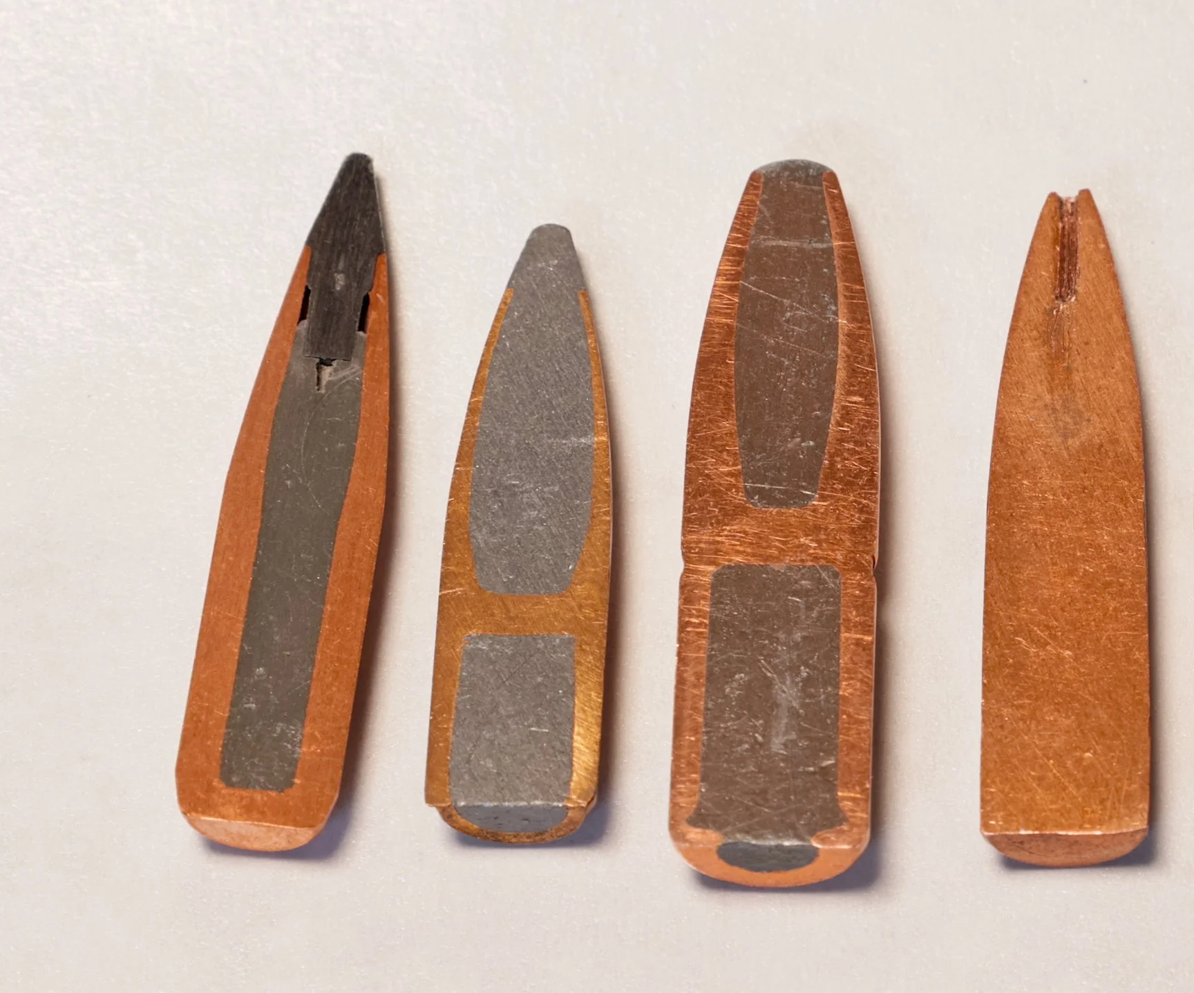 Slight differences in bullet diameter don’t matter nearly as much as materials and construction. Premium controlled expansion bullets are engineered to withstand severe impact energies and retain enough mass in one piece to expand, yet maintain sufficient shank mass to drive that expanded nose deep. L. to R. are: bonded Swift Scirocco, Nosler Partition, Swift A-Frame, and Barnes X. All have felled elk for the author.