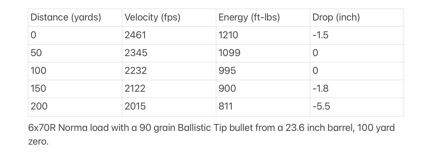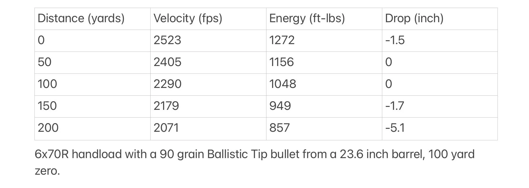 To see what a tailored 6x70R handload will do for you, look at the following table. It shows velocity, energy and drop of a load with the same 90 grain Ballistic Tip, but with a 2,523 fps muzzle velocity.
