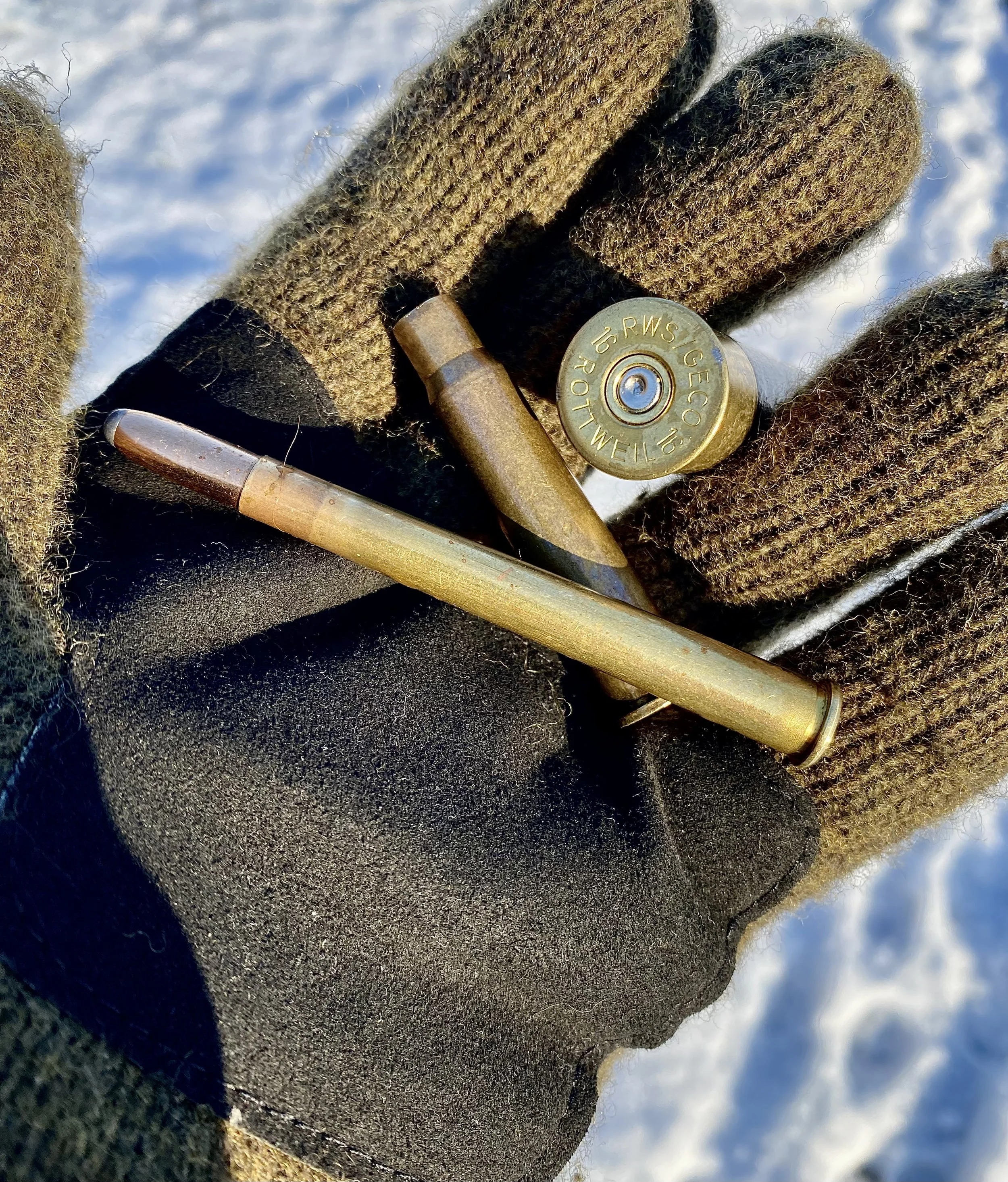 The 6x70R next to a 16 gauge shot shell and a fired 8mm Mauser.