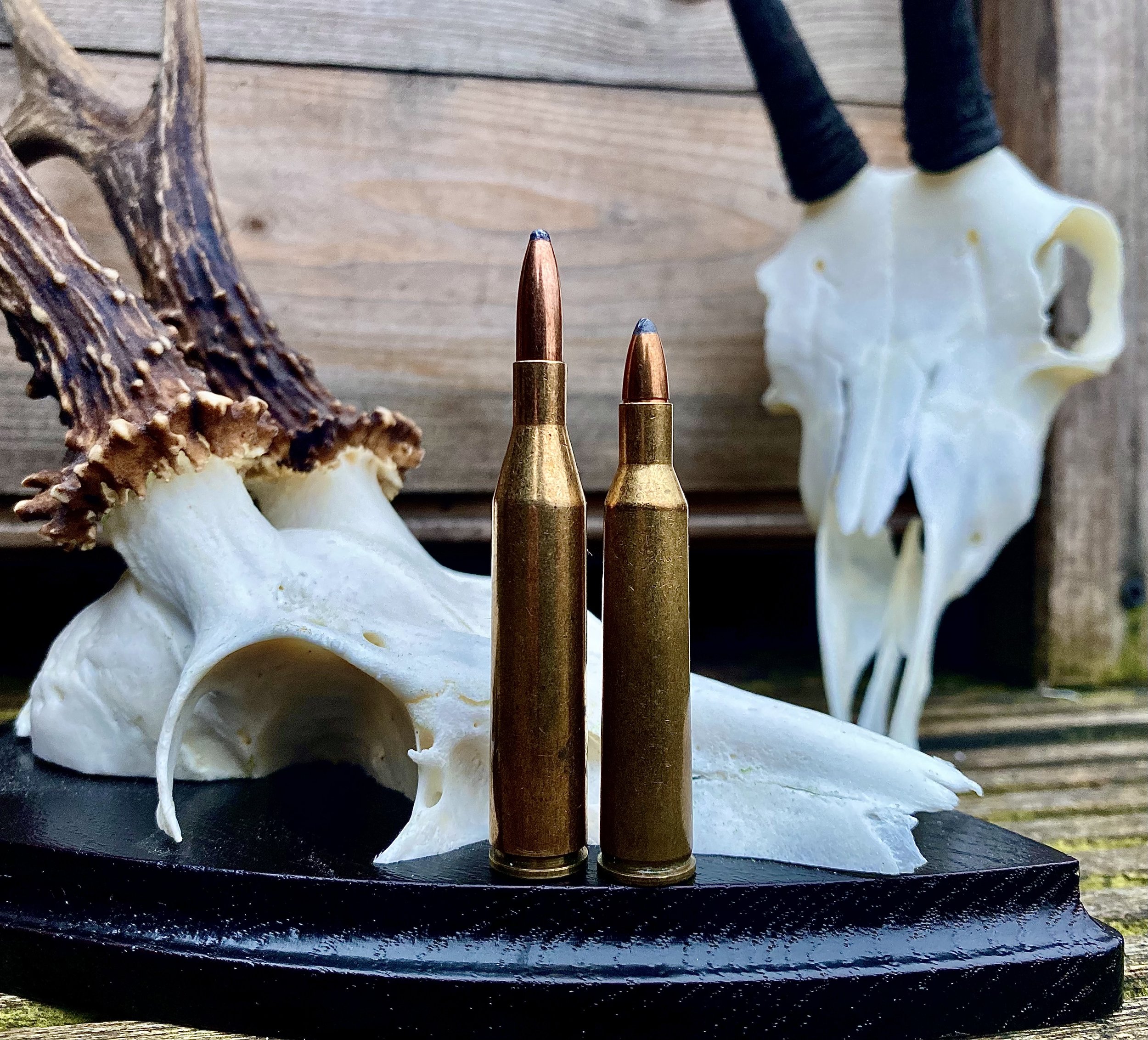 The 5.6x61 Super Express vom Hofe (left) in front of the intended game, roe deer and chamois. A .220 Swift for comparison.