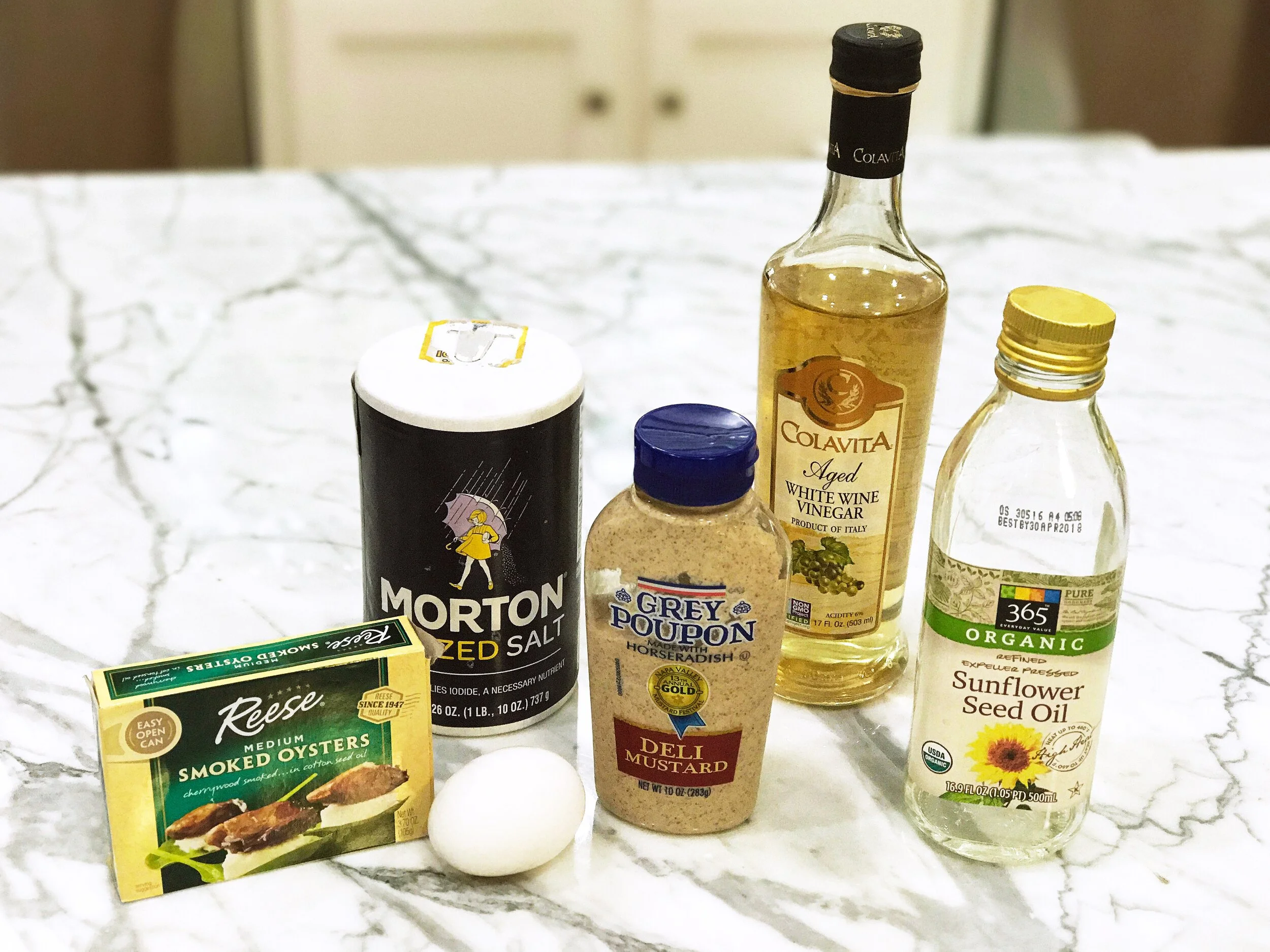 Fish with Smoked Oyster Mayonnaise. A picture of the ingredients used in making the Smoked Oyster Mayonnaise.