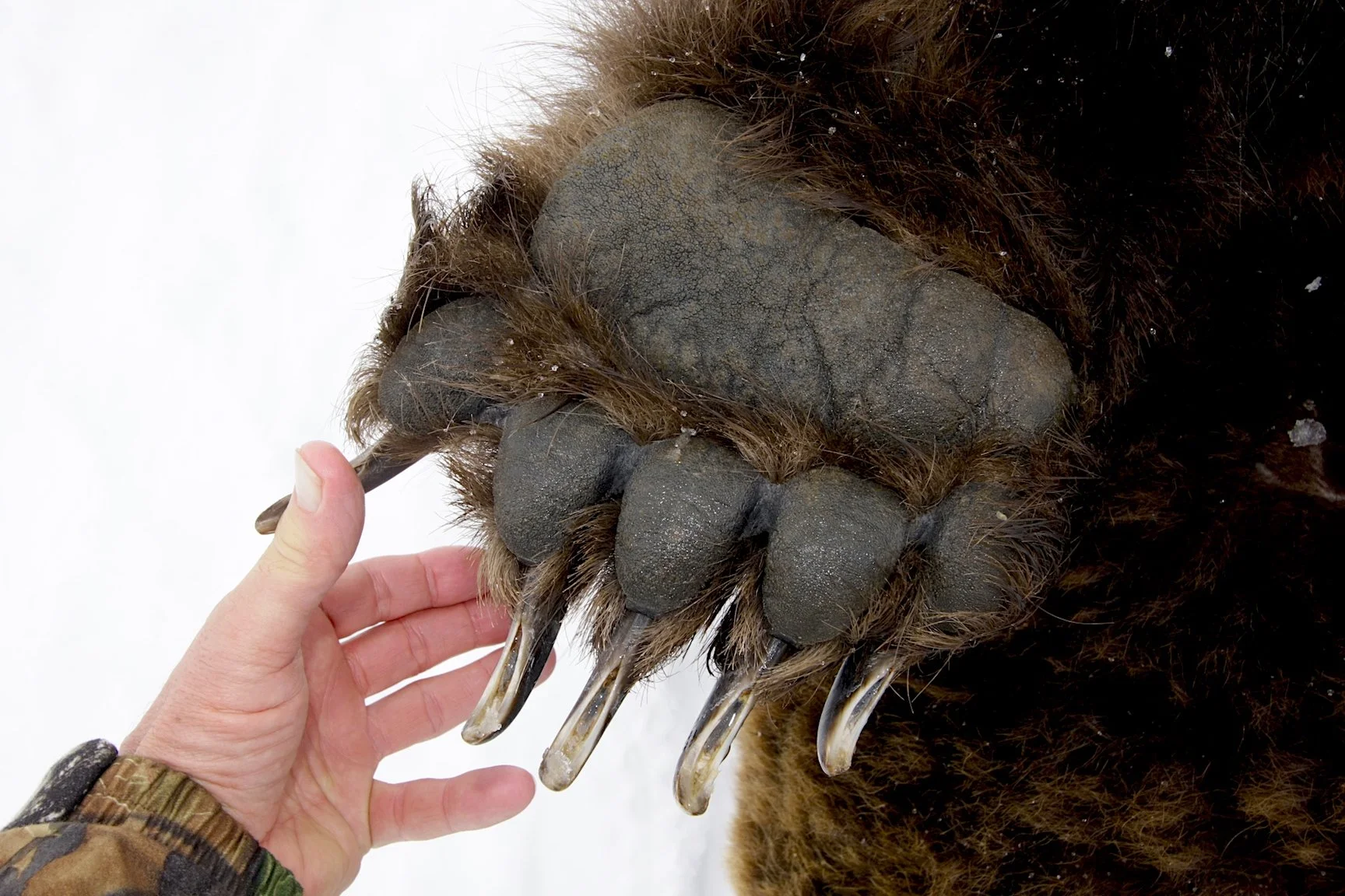 Would you prefer shaking hands with a brown bear’s paw after application of a 338 Win. Mag. or 375 H&H Mag? The latter die the introductions on this bear. Dakota 97 bolt-action, Swarovski Z6 scope and 300-gr. Swift A-Frame bullet. First shot paralyzed the bear, second ended it.