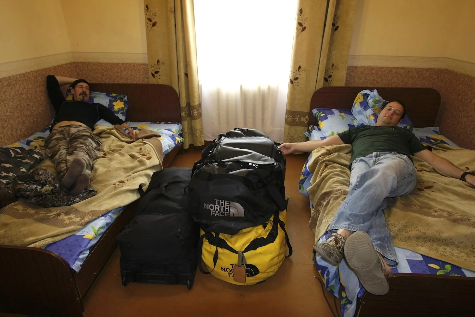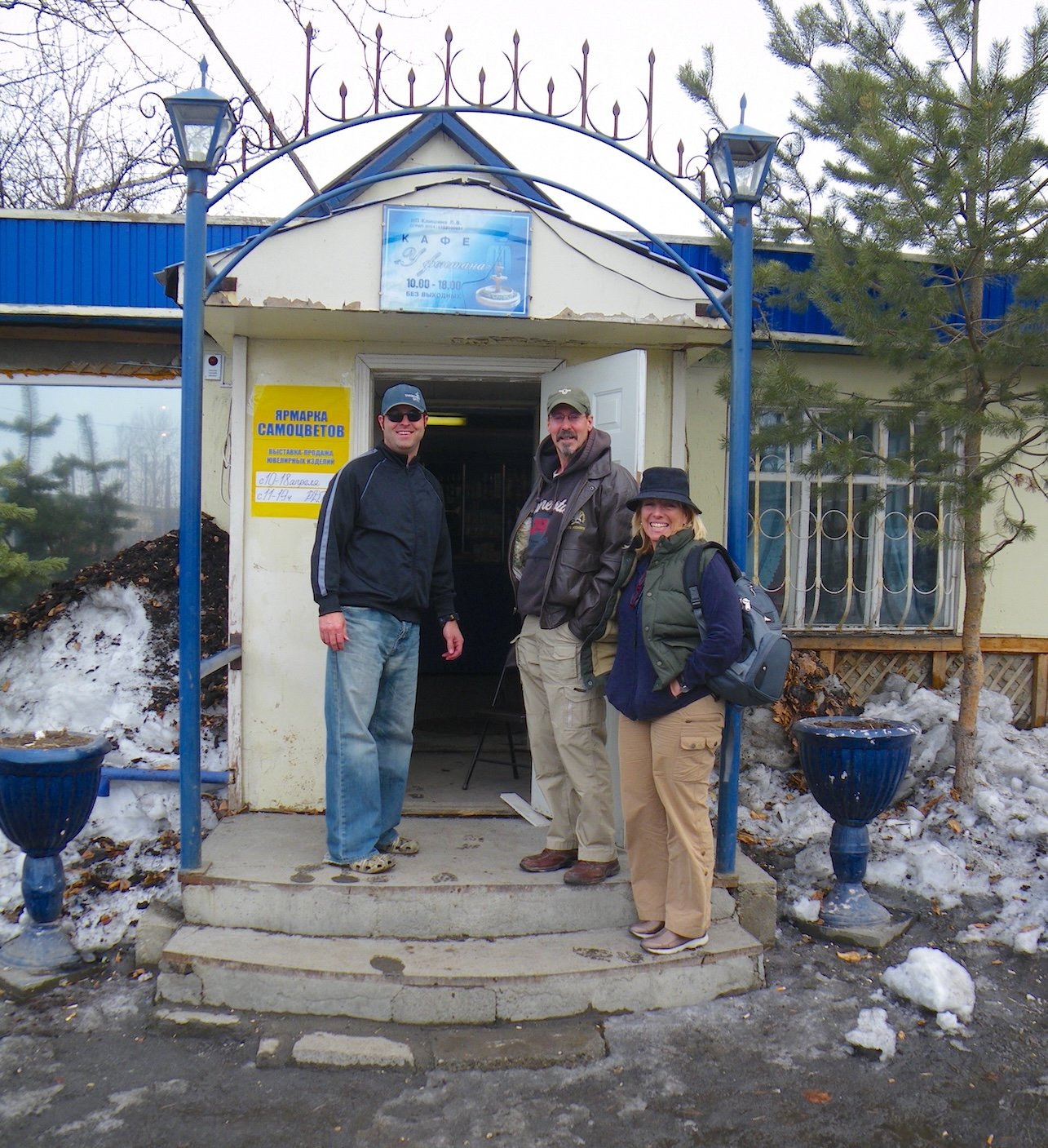 Welcome to the hotel Kamchatka. Our party stands at the entrance of the rural lodging where we overnighted during the long, slow drive from Petropavlovsk to our remote bear hunting areas. The highways were gravel, a long strip of potholes with remnants of road around them.