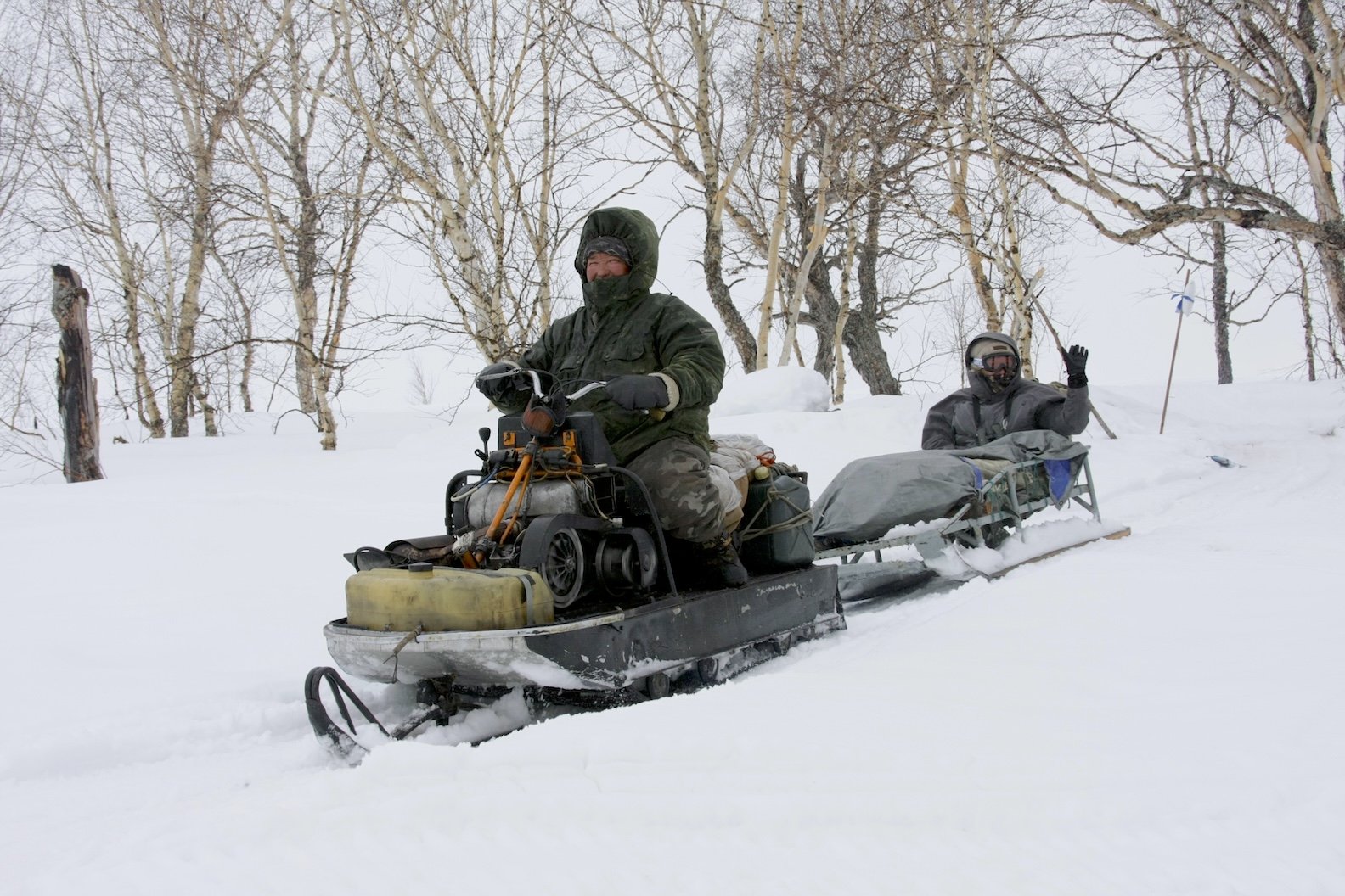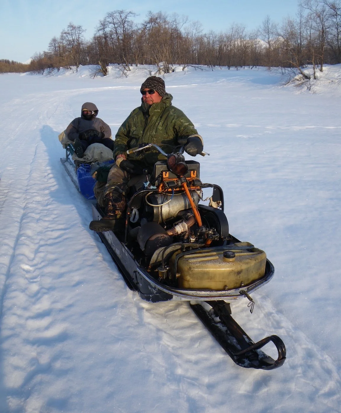 Almost there. Misha pilots Linda to camp with his vintage snow machine, much of which he repaired or rebuilt daily as necessary.