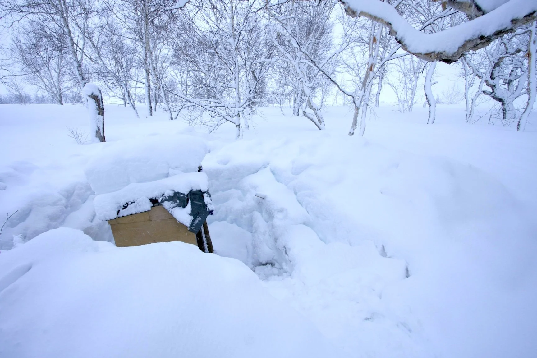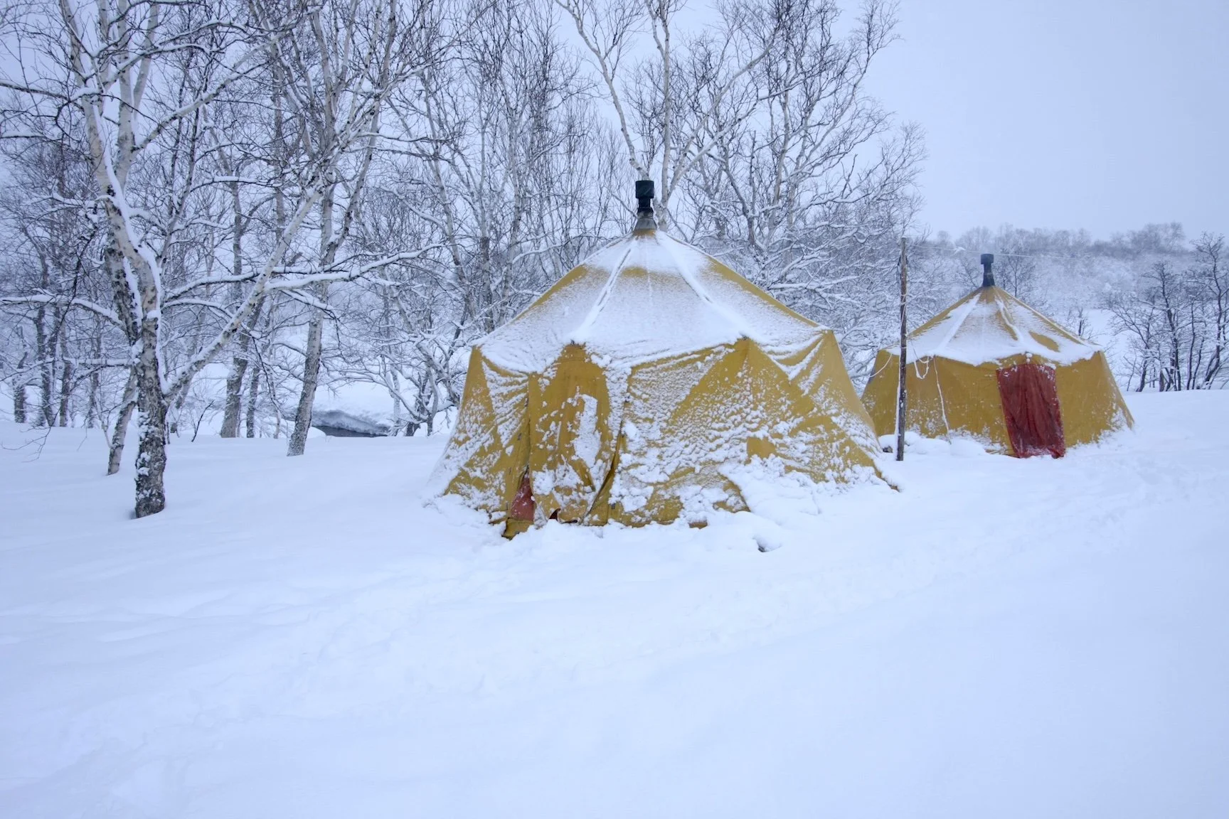 The camp cook shack huddled under about 10 feet of snow. The sleeping tents hovered atop it.