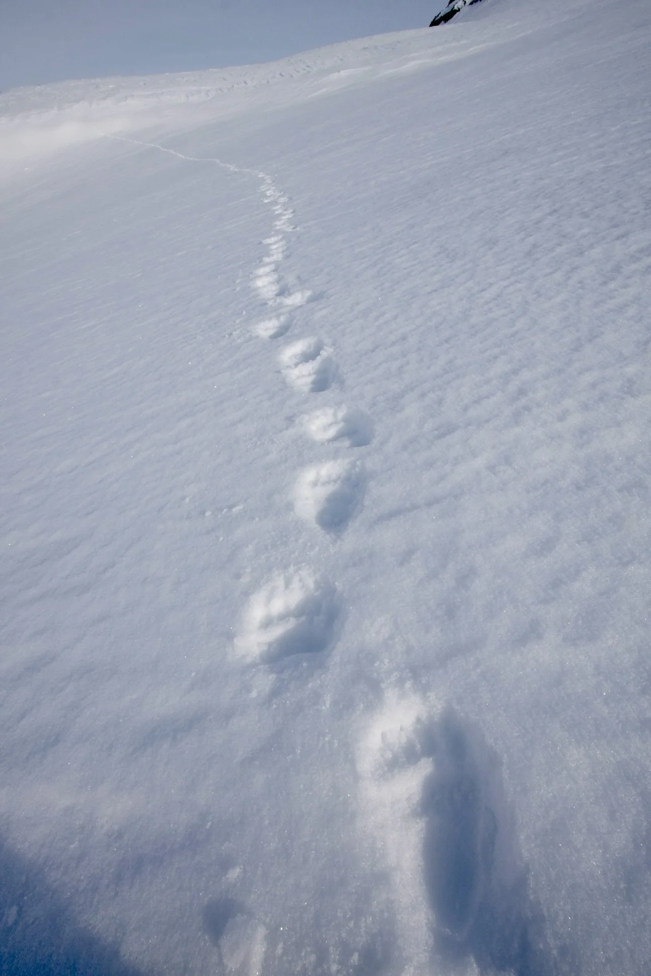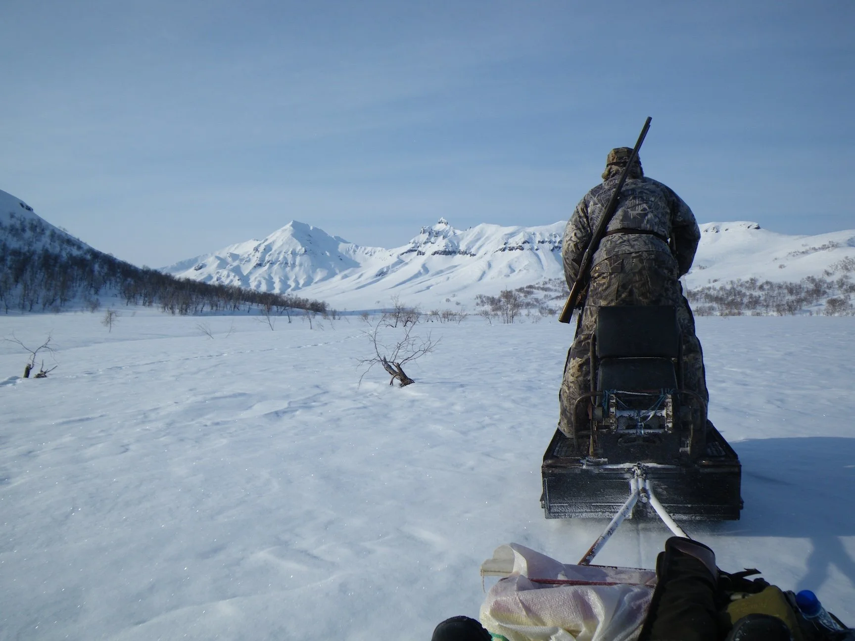 Sasha waved me back onto his ancient snow machine. We looped up the valley, parked behind a shoulder of mountain and began hiking up the hard snow. It was like walking on asphalt. The air was thin, but not as thin as our chances for catching up with this bear. Despite angling to cut it off, we broke over the shoulder to find our quarry already high above us, ambling along but covering ground as we never could. Reminded me of caribou. You don’t walk down caribou, and apparently you don’t walk down climbing Russian bears, either. Sasha waved at the bear in surrender. We studied his tracks. Probably an 8.5-footer. Not big enough for the first morning anyway.