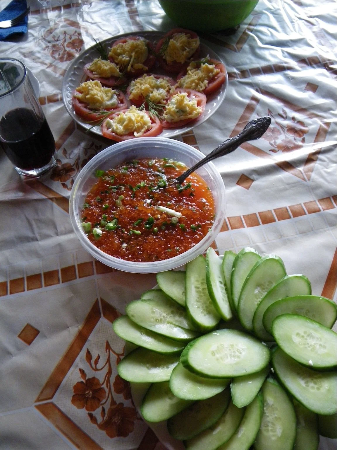 Fresh produce and fish eggs made for delicious variety the first day or two, but when they ran out…