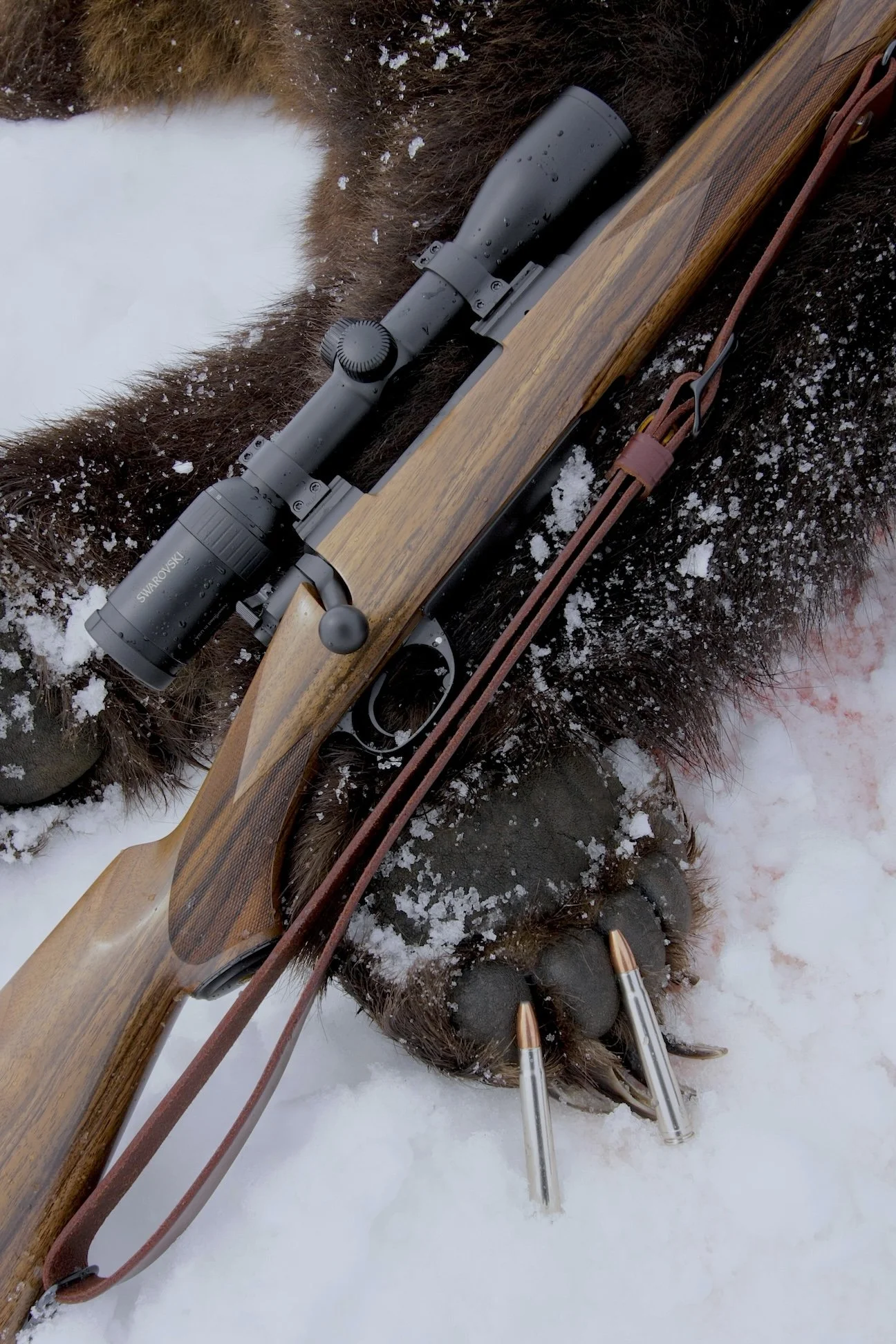 I popped the covers from the scope and snicked a round into the chamber. The bear emerged from a dip in the snow, stopped and squinted, or at least looked as if it were squinting -- right at us. I looked at my guide one more time for confirmation. Shoot this one? He nodded. Vigorously. The bear began loping, left to right. I thought I’d let him stop, but he showed no inclination to do that. The wind was in our favor, but he’d apparently seen or heard enough. The scope was set on 3X just in case. I swung it just to the front edge of the shoulder and fired. The boar dropped in its tracks, kicking feebly. I put one more 300-grain A-Frame in its brisket, angling up toward the spine, but it was superfluous. That first bullet had broken the shoulder, clipped the spine and lacerated the lungs. In seconds the bear stilled, lying big and dark in a vast white world of sagging snow with more on the way.