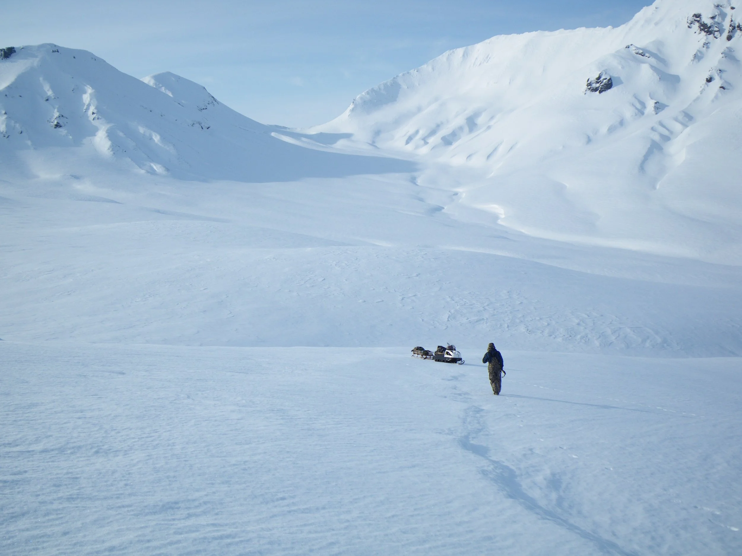 Under clear skies and sub-freezing temperatures nine days would be a surfeit of time. A snowmachine glides like smoke over frozen snow, taking you over 50 miles of mountain valleys and ridges each day, dropping you at glassing points where an 8X Swarovski EL binocular will reveal hulking brown bears four miles away. A 20-60X spotting scope will pull them into your circle of influence from ten miles. You see their sleepy heads poke from snowy dens halfway up rocky peaks. You follow the blue shadows of their trails down ridges, across valleys and right into the black, leathery pads that laid them. That’s the way it happened our first day, a day that lulled us into believing we could continue this easy path all week, cruising and snooping, picking and choosing. But wet weather was on the way.