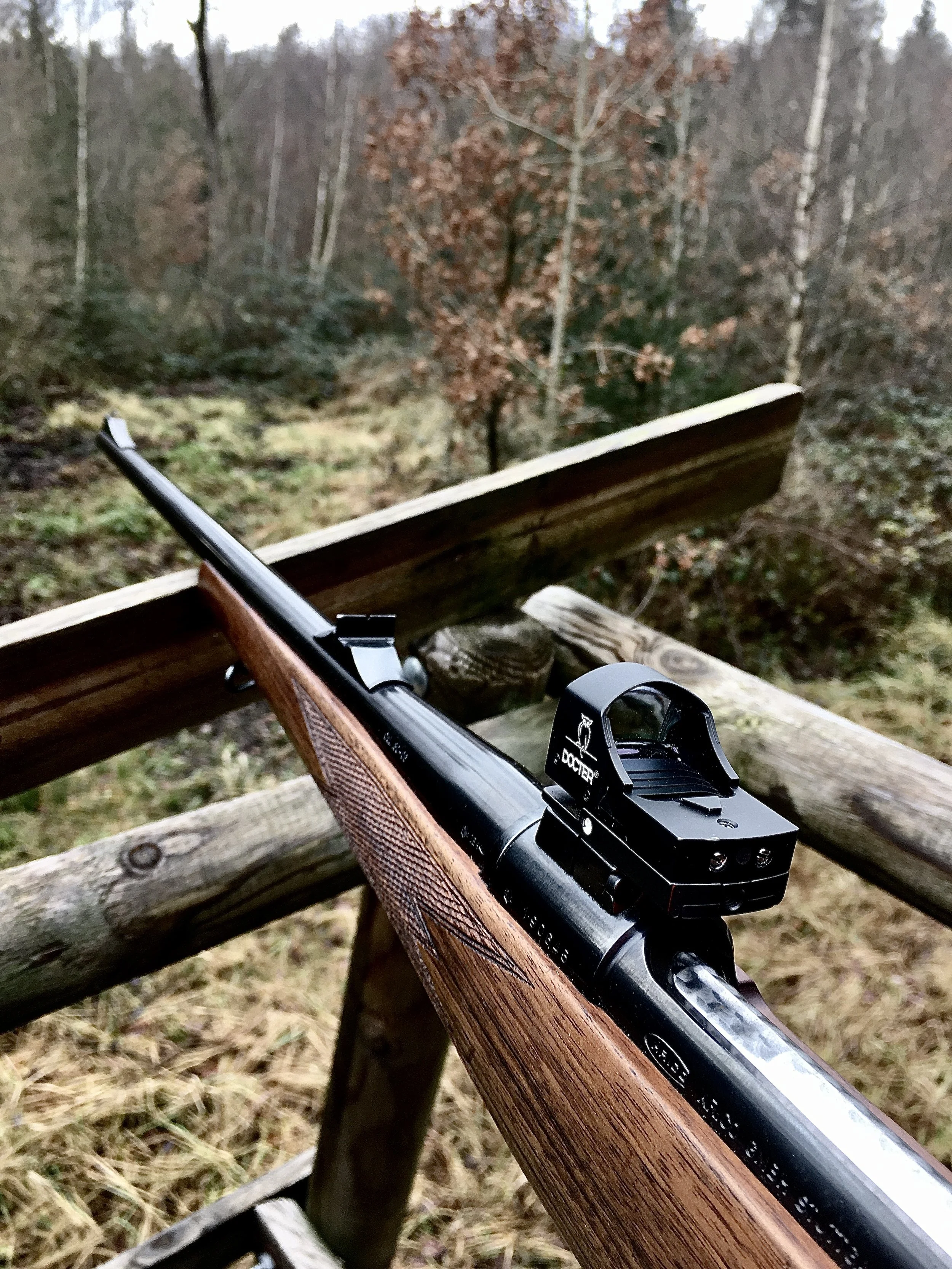 Iron sights or non-magnifying optical sights suit this type of hunting best. Even low-powered scopes have several disadvantages for extreme close shots. First, it is not easy to aim true when you have little to no side picture. That's even more true for moving targets. Second, you won't notice little branches and other hindrances in your shooting lane due to magnification. Although not everyone agrees, I'm convinced that even slow and heavy projectiles can be deflected by small branches blocking the path to the quarry's vital zone. You'll find a hole to poke the bullet through much more reliably without even 2x magnification. The nature of still hunting, and its appeal, means 50-yard shots are long. Those shots are not too hard to learn to take without magnification. In the same vein, the importance of practicing quick and precise shots with your chosen sight is needless to mention.