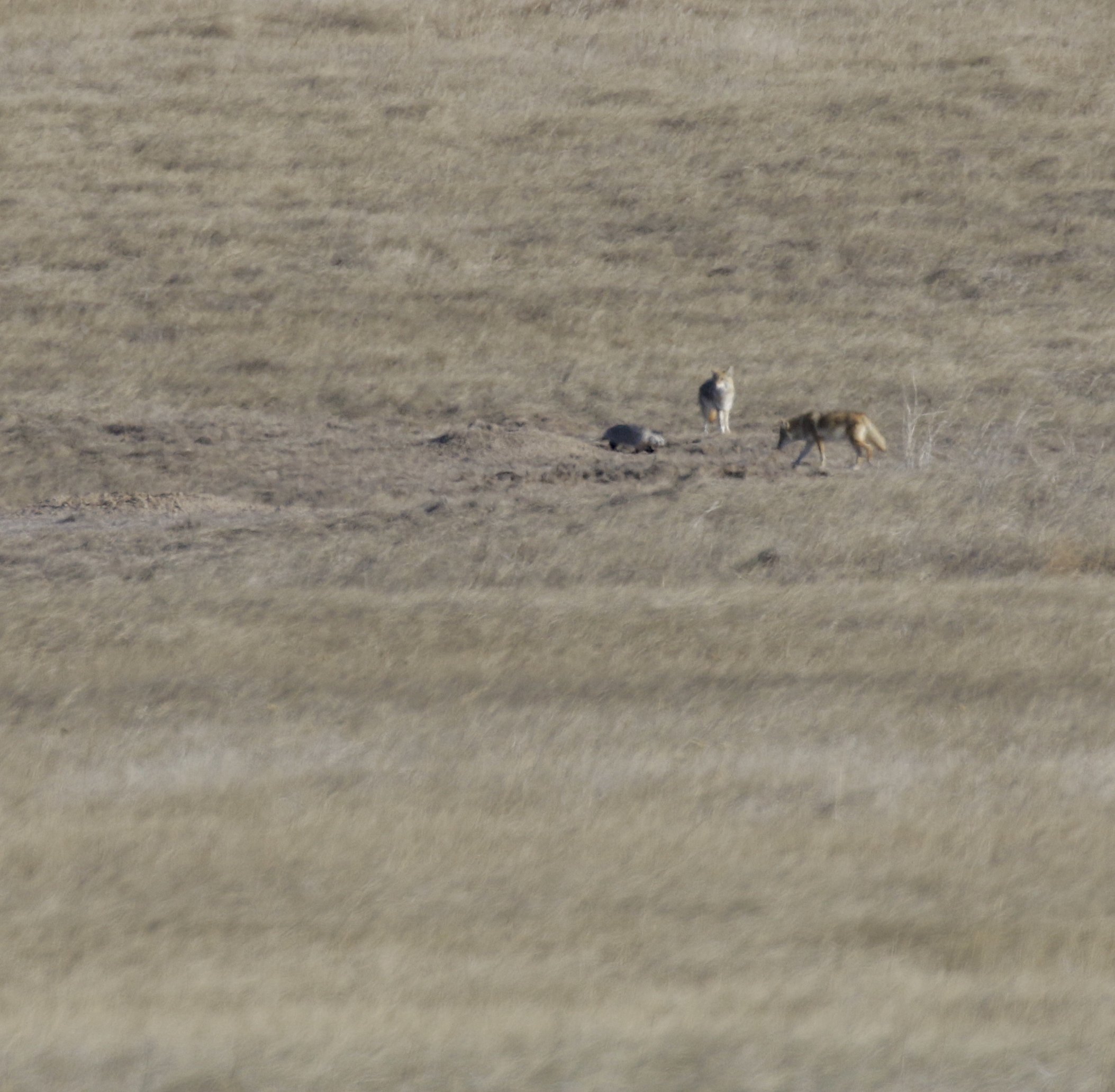 Two coyotes and a badger hunting prairie dogs. The long range, super telephoto image is compromised by atmospheric distortion, but note the differences in size and shape. Clearly the short-legged badger wasn’t built for running with the big dogs. But the coyotes aren’t engineered for moving quickly through small tunnels, either. We suspect the badger digs into prairie burrows to catch them while the coyotes wait for any to pop out. This is a dramatic example of a rare, non-confrontational, symbiotic relationship among predatory animals.
