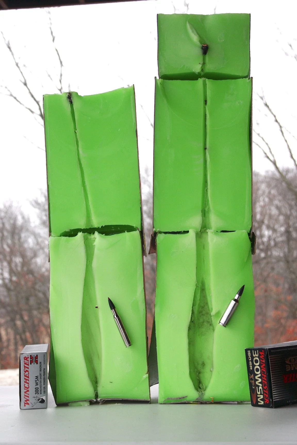 The same 180-grain XP3 bullet shot into wax test tubes show that the 30-06 on left penetrates about two inches less than the 300 WSM (which duplicates the MV of the 300 Win. Mag.) The 30-06 carves a slightly narrower wound channel, too, but I doubt even the biggest, toughest animal would survive it.
